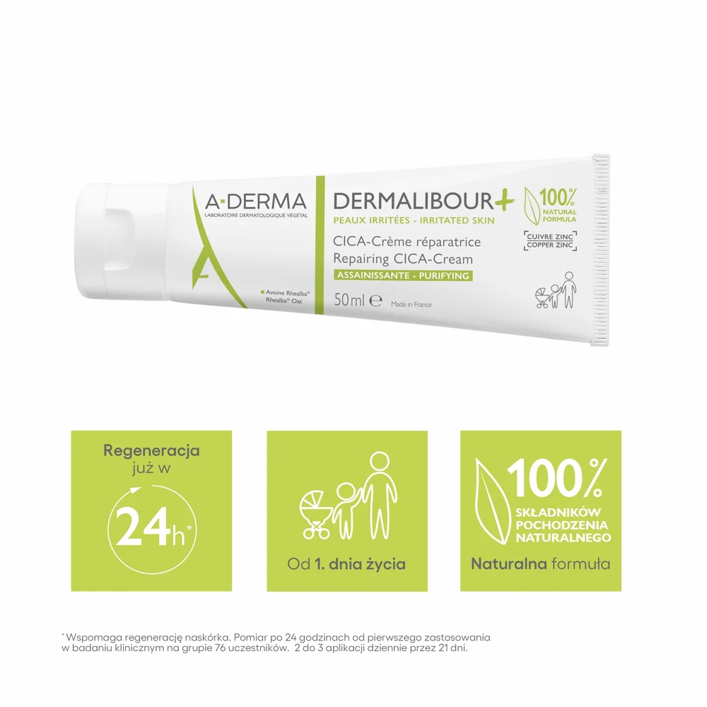 A-Derma Dermalibour + Cica Krem regenerujący to w 100% naturalna pielęgnacja, przeznaczona dla podrażnionej i nadreaktywnej skóry całej rodziny, już od 1. dnia życia: podrażnienia twarzy, dłoni i wokół ust, miejscowe przesuszenia skóry, odparzenia okolic pieluszkowych, podrażnienia sutków związane z karmieniem piersią.Stosowanie produktu