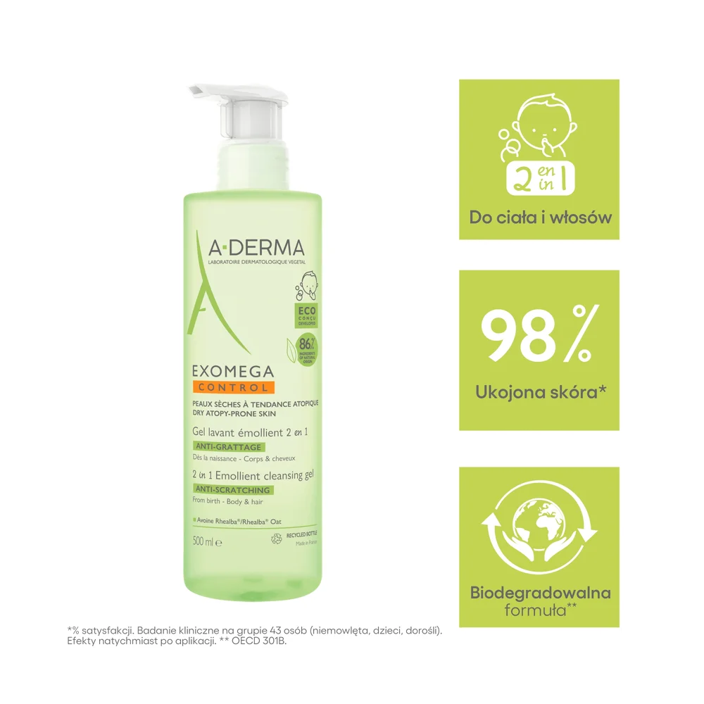 A-derma Exomega Control Skóra sucha skłonna do atopii Żel emolient do mycia 2 w 1 przeciw drapaniu od 1. dnia życia - Ciało & włosy przeznaczony do oczyszczania skóry atopowej lub suchej. Wskazany zarówno dla dzieci, jak i dorosłych.Stosowanie produktu