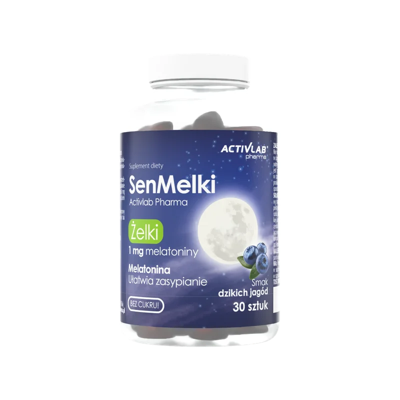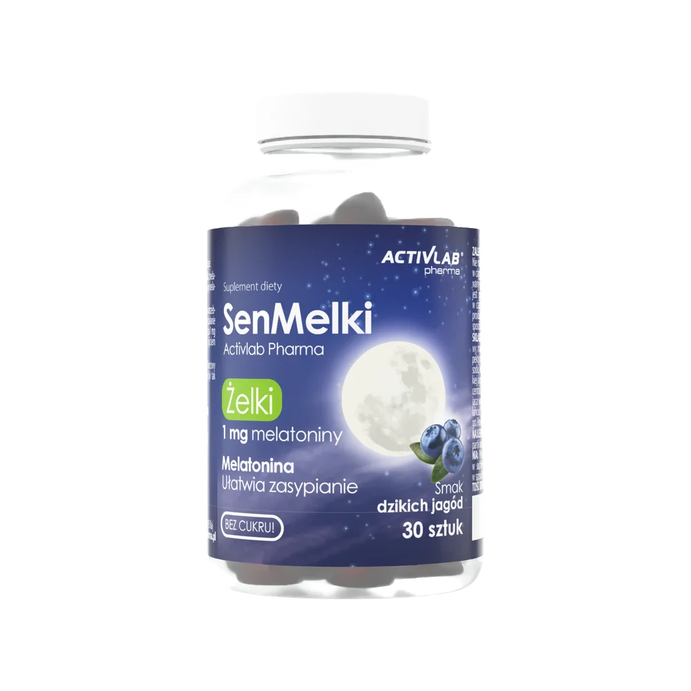 Suplement diety - ActivLab Pharma, SenMelki, to pyszne jagodowe żelki dla osób dorosłych, które zawierają melatoninę i nie mają dodatku cukru. Jedna żelka może pomóc w łatwiejszym zasypianiu.