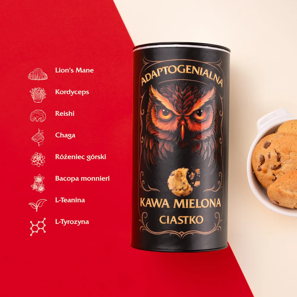 Adaptogenialna kawa mielona ciastko to suplement diety. Mielona kawa o smaku ciastka z dodatkiem ekstraktów adaptogennych i naturalnych aromatów, przeznaczona do zaparzania. Składniki suplementu wspierają koncentrację oraz poziom energii.Składniki