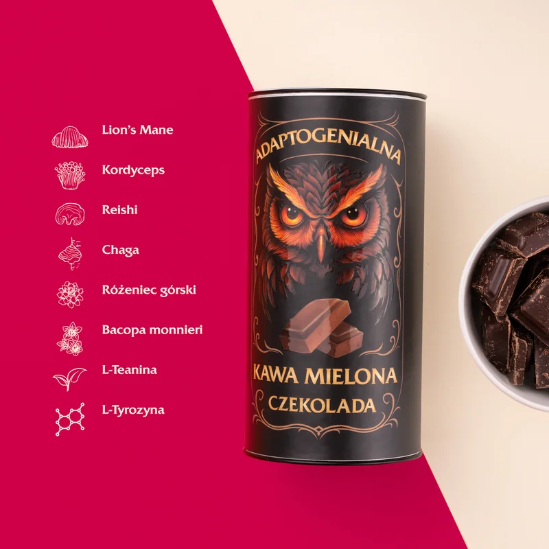 Adaptogenialna kawa mielona czekolada to suplement diety. Mielona kawa o smaku czekoladowym zawierająca mieszankę adaptogenów i aromatów, przeznaczona do przygotowania jak tradycyjna kawa. Składniki suplementu wspierają koncentrację i poziom energii.Składniki