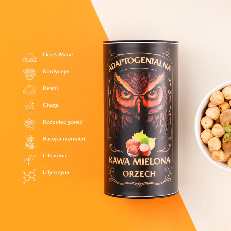 Adaptogenialna kawa mielona orzech to suplement diety. Zawiera mieszankę kawy z ekstraktami adaptogennymi i aromatem orzechowym; składniki suplementu wspierają mechanizmy adaptacyjne organizmu i poprawiają doznania smakowe.Składniki