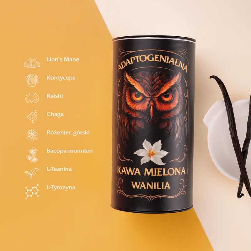 Adaptogenialna kawa mielona wanilia to suplement diety. Mielona kawa z dodatkiem adaptogenów i aromatem waniliowym, przeznaczona do przygotowania napoju. Składniki suplementu wspierają mechanizmy adaptacyjne organizmu oraz utrzymanie poziomu energii.Składniki