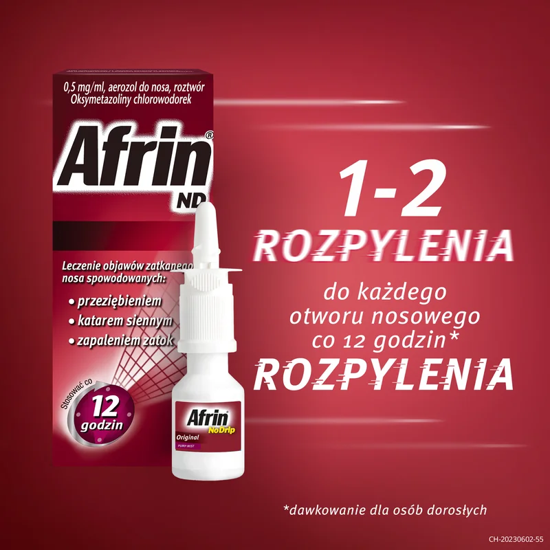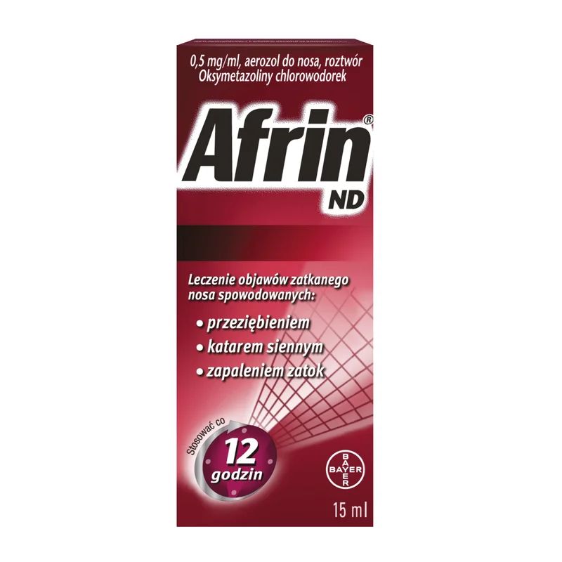 Pacjenci ze stwierdzoną wrażliwością na leki sympatykomimetyczne lub którykolwiek ze składników produktu leczniczego. Nie należy stosować produktu Afrin ND u pacjentów: przyjmujących inhibitory monoaminooksydazy (MAO) lub pacjentów, którzy przyjmowali je w okresie ostatnich 2 tygodni, z jaskrą z wąskim kątem przesączania, po przezklinowym usunięciu przysadki, ze stwierdzoną nadwrażliwością lub idiosynkrazją na którykolwiek składnik produktu, z zapaleniem skóry i błony śluzowej przedsionka nosa oraz suchym zanikowym zapaleniem błony śluzowej nosa, z ostrą chorobą wieńcową i lewokomorową niewydolnością serca („astmą sercową”). Produktu Afrin ND nie należy stosować u dzieci w wieku poniżej 6 lat.Działania niepożądane