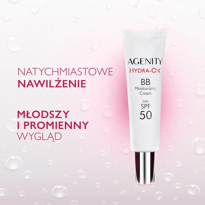 Agenity Hydra-Ox BB, Krem nawilżający na dzień 20 medium beige SPF 50 to kosmetyk, który poprawia wygląd skóry, wyrównując jej koloryt i przywracając jej blask. Redukuje drobne linie i zmarszczki, a także chroni przed szkodliwymi czynnikami środowiskowymi i promieniowaniem UV. Skóra staje się miękka, elastyczna i gładka, zyskując zdrowy, wypoczęty wygląd. Formuła jest niekomedogenna, nie zatyka porów, co sprawia, że jest odpowiednia dla każdego typu cery, w tym skóry wrażliwej.Stosowanie produktu