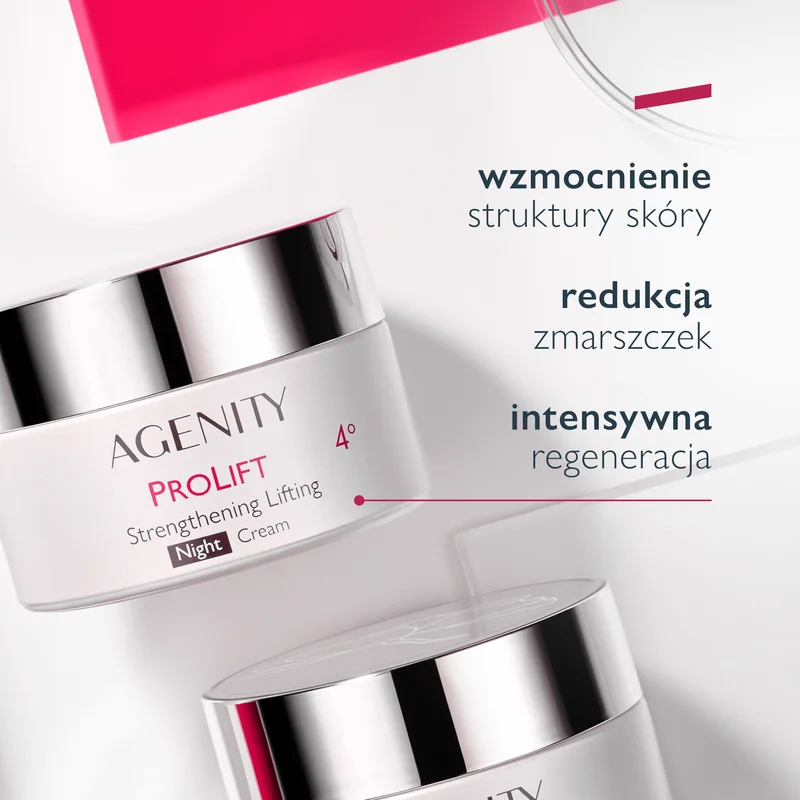 Agenity Prolift 4°, Krem liftingujący wzmacniający na noc to produkt kosmetyczny przeznaczony do pielęgnacji skóry cienkiej i z widocznymi zmarszczkami, idealny dla kobiet po 55. roku życia.Składniki/Ingredients