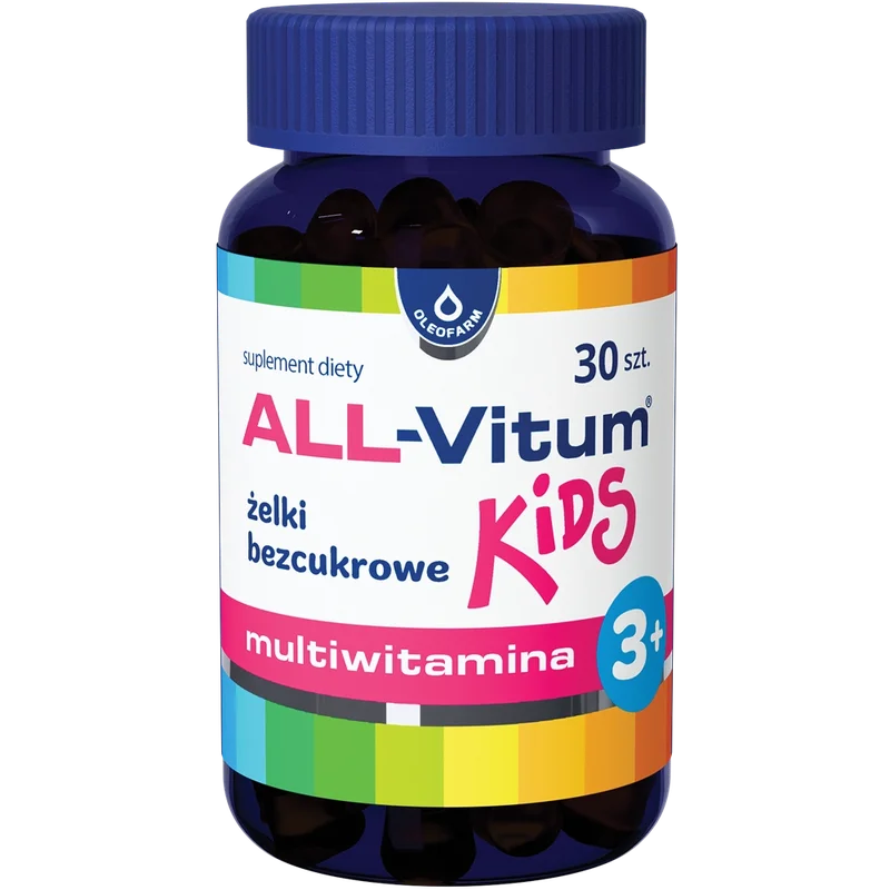 All-Vitum Kids to suplement diety w formie żelków bezcukrowych. Składniki suplementu wspierają prawidłowe funkcjonowanie organizmu dzieci oraz pomagają w utrzymaniu odpowiedniego poziomu witamin i minerałów. Formuła została opracowana z myślą o potrzebach najmłodszych, a żelkowa forma jest atrakcyjna dla dzieci. Produkt odpowiedni dla dzieci powyżej 3. roku życia.