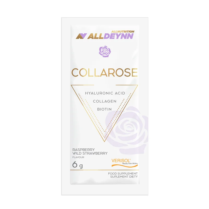 Alldeynn collarose Kolagen to suplement diety w formie proszku, opracowany dla osób dorosłych. Produkt w swoim składzie zawiera kolagen, witaminę C, biotynę oraz kwas hialuronowy.