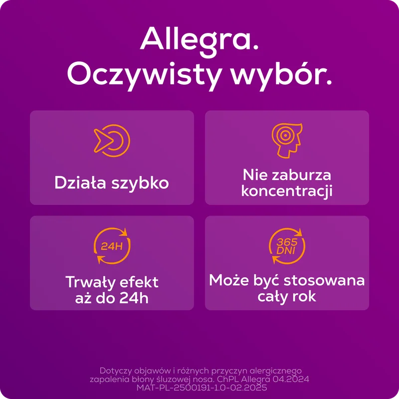 Jest mało prawdopodobne, aby Allegra wpływał na zdolność prowadzenia pojazdów lub obsługę maszyn. Oznacza to, że pacjenci mogą prowadzić pojazdy mechaniczne i wykonywać zadania wymagające koncentracji. Jednakże, przed prowadzeniem pojazdów lub obsługiwaniem urządzeńmechanicznych należy upewnić się, że lek nie powoduje senności lub zawrotów głowy. Jeśli wystąpią takie objawy, nie należy prowadzić pojazdów ani obsługiwać maszyn.Producent: Opella Healthcare Poland Sp. z o.o. , ul. Bonifraterska 17, 00-203 Warszawa To jest lek. Dla bezpieczeństwa stosuj go zgodnie z ulotką dołączoną do opakowania. Zwróć uwagę na przeciwwskazania. W przypadku wątpliwości skonsultuj się z lekarzem lub farmaceutą.