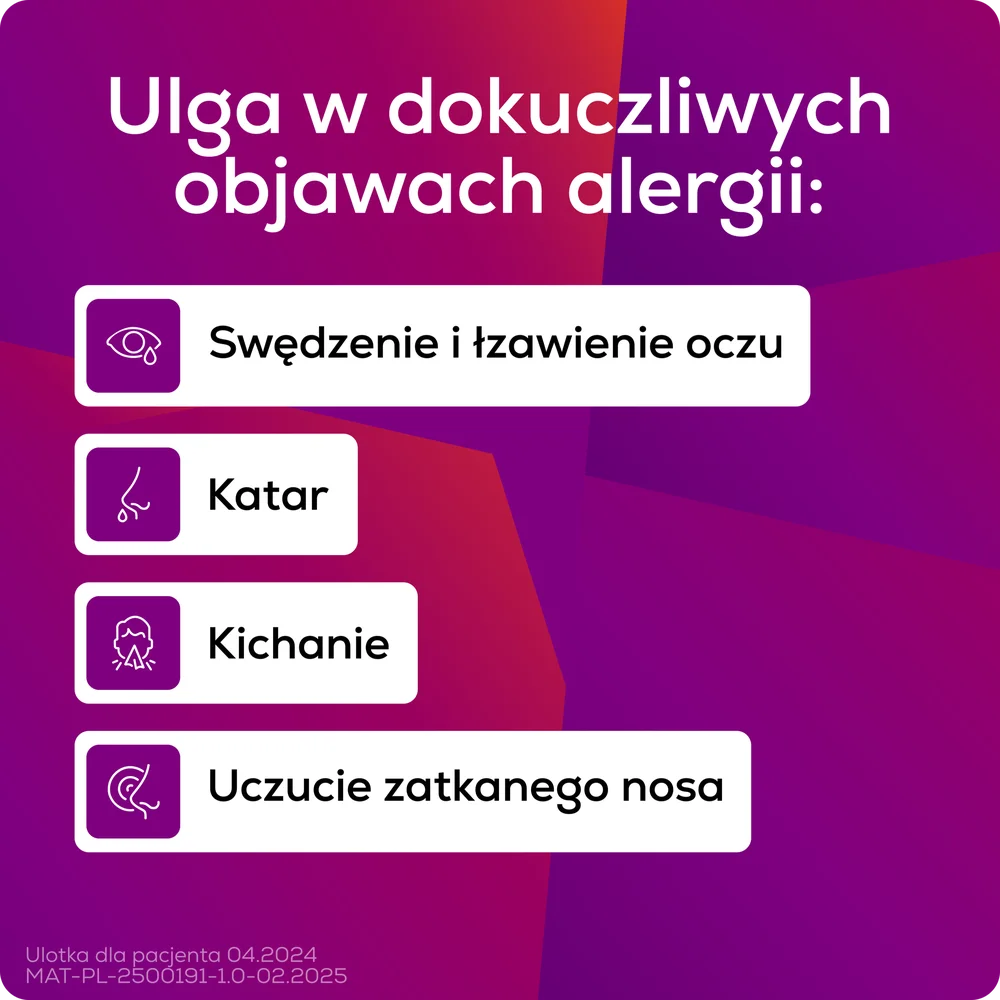 Lek Allegre stosuje w się wleczeniu objawów kataru siennego takich jak: kichanie, swędzenie nosa, katar lub uczucie zatkanego nosa oraz swędzenie, zaczerwienienie i łzawienie oczu.