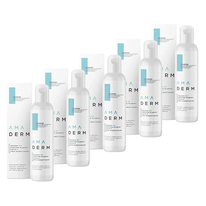 Szampon przeciwłupieżowy nawilżająco-łagodzący Amaderm to łagodny kosmetyk myjący o działaniu przeciwłupieżowym, przeznaczony do stosowania przy: łupieżu o różnym pochodzeniu zarówno suchym, jak i tłustym, atopowym zapaleniu skóry głowy, łojotokowym zapaleniu skóry głowy, łuszczycy skóry głowy, wspomagająco przy łupieżu pstrym. Dzięki odpowiednio dobranej kompozycji myjącej Szampon Amaderm sprawdzi się także w wypadku wyjątkowo delikatnej i wrażliwej skóry głowy. Preparat jest odpowiedni do stosowania już od 6 roku życia.Stosowanie produktu