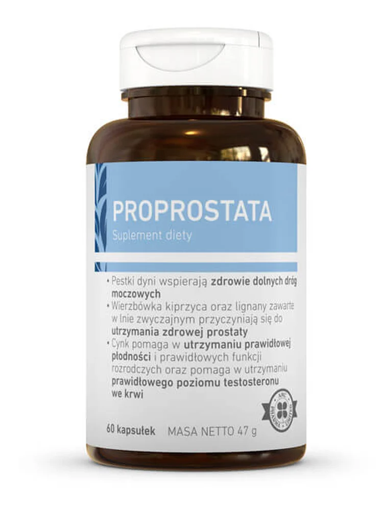 ProProstata to suplement diety, którego składniki wspierają funkcje układu moczowego oraz przyczyniają się do utrzymania prawidłowego stanu prostaty. Produkt przeznaczony dla dorosłych mężczyzn.