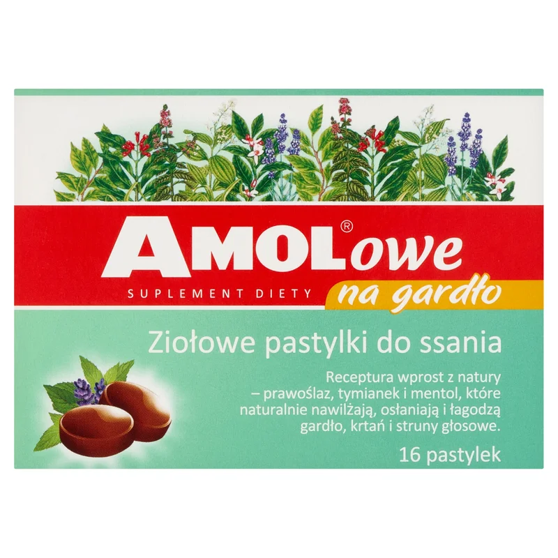 Amolowe na gardło to suplement diety w formie pastylek do ssania, które dzięki zawartości ekstraktów z prawoślazu i tymianku oraz mentolu łagodzą przesuszone, podrażnione gardło, nawilżają i chronią śluzówkę gardła, przez co pozwalają na utrzymanie prawidłowej emisji głosu i ułatwiają przełykanie. Produkt przeznaczony dla dorosłych.