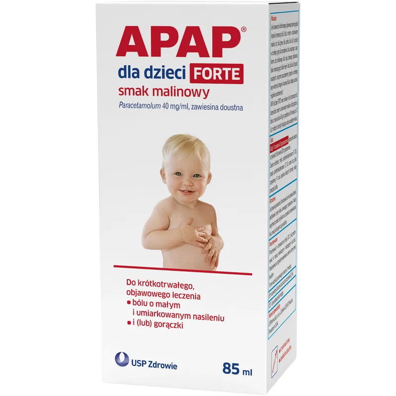 APAP dla dzieci FORTE smak malinowy, 40 mg/ml, zawiesina doustna to produkt leczniczy stosowany w łagodzeniu bólu o nasileniu łagodnym i umiarkowanym oraz w obniżaniu gorączki u dzieci. Produkt dla dzieci o masie ciała do 40 kg (w przybliżeniu od 0 miesięcy do 12 lat).