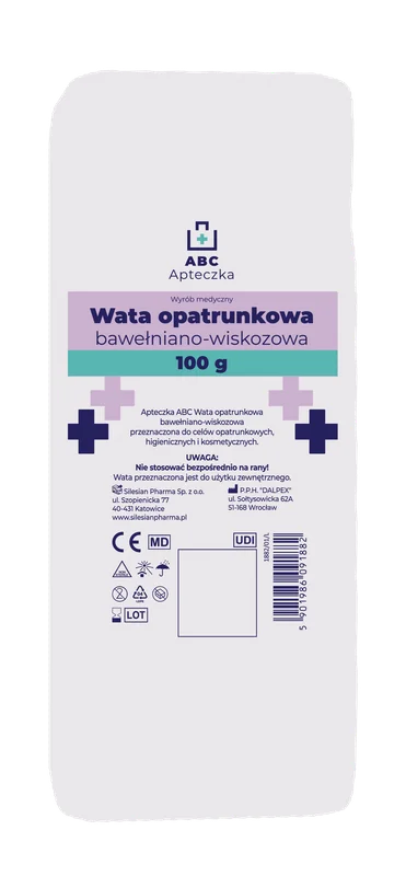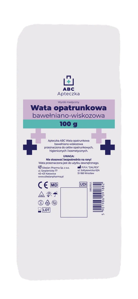 Apteczka ABC wata bawełniana 100 g to wyrób medyczny. Przeznaczona jest do stosowania w celu oczyszczania ran oraz jako materiał opatrunkowy. Wata jest wykonana z czystej bawełny, co zapewnia jej dobrą chłonność i delikatność. Produkt może być używany w warunkach domowych oraz w medycynie. Należy przechowywać w suchym miejscu, z dala od źródeł zanieczyszczenia.Składniki