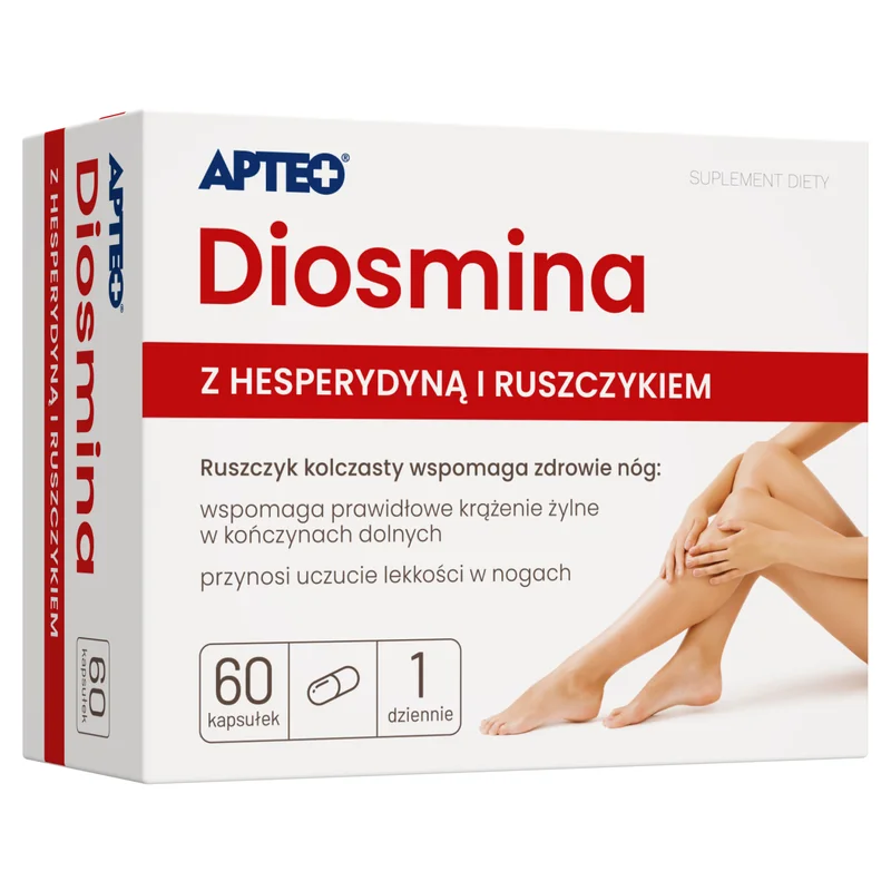 Apteo Diosmina z hesperydyną to suplement diety w postaci kapsułek, którego składniki wspierają prawidłowe funkcjonowanie układu krążenia, przyczyniają się do utrzymania elastyczności naczyń krwionośnych oraz wspomagają prawidłowy przepływ krwi. Preparat wspiera naturalne procesy regeneracyjne organizmu i komfort codziennego funkcjonowania. Produkt przeznaczony dla osób dorosłych.
