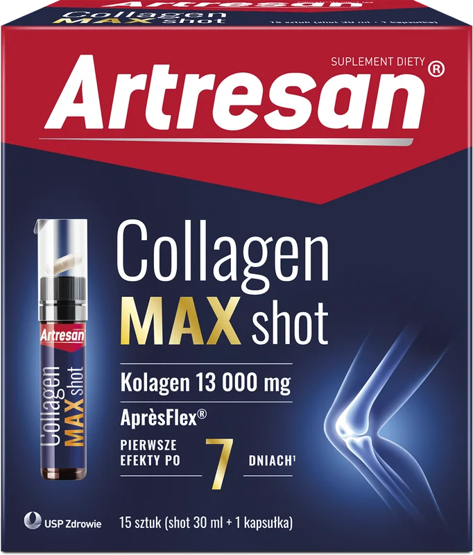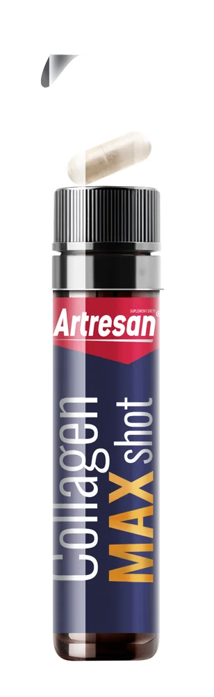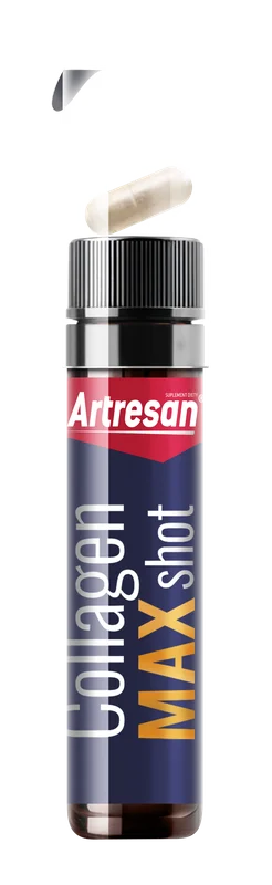 Artresan Collagen Max Shot to zestaw suplementów diety składający się z porcji płynnego kolagenu poddanego hydrolizie enzymatycznej oraz kapsułki zawierającej AprèsFlex wraz z witaminami i minerałami. Każda porcja dostarcza 13 000 mg kolagenu, co czyni produkt skoncentrowanym źródłem tego składnika. Produkt przeznaczony jest dla osób dorosłych.