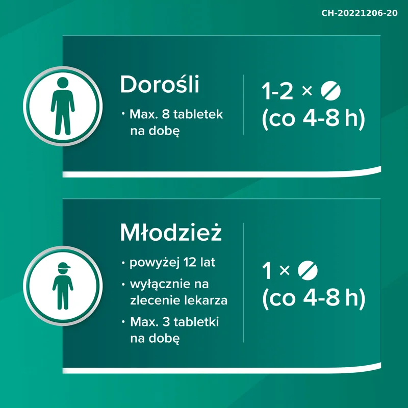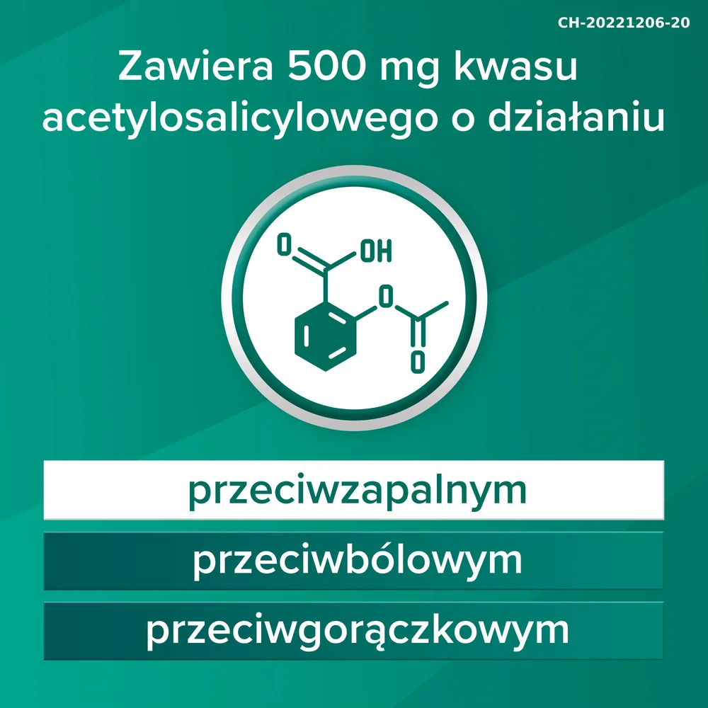 Młodzież w wieku powyżej 12 lat: lek może być stosowany u młodzieży w wieku powyżej 12 lat wyłącznie na zlecenie lekarza. Należy przyjąć jednorazowo 1 tabletkę (tj. 500 mg kwasu acetylosalicylowego). W razie konieczności dawka jednorazowa może być powtarzana nie częściej niż co 4 do 8 godzin. Nie należy przyjmować więcej niż 3 tabletki (tj. 1500 mg kwasu acetylosalicylowego) na dobę.