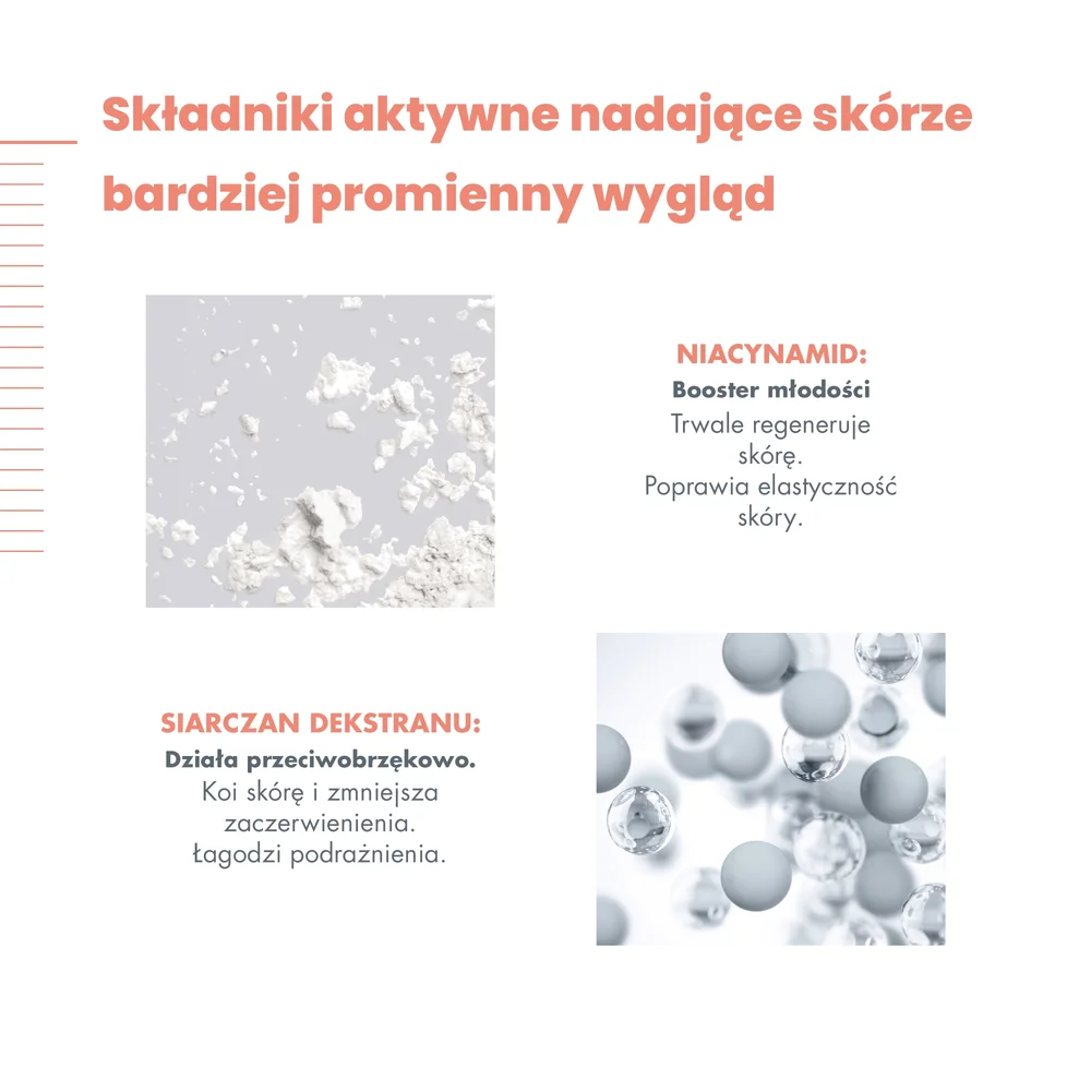 Krem ujędrnia skórę pod oczami, wypełnia zmarszczki oraz zmniejsza opuchnięcia i cienie. Główne składniki aktywne: siarczan dekstranu, czysty kwas hialuronowy, niacynamid.
