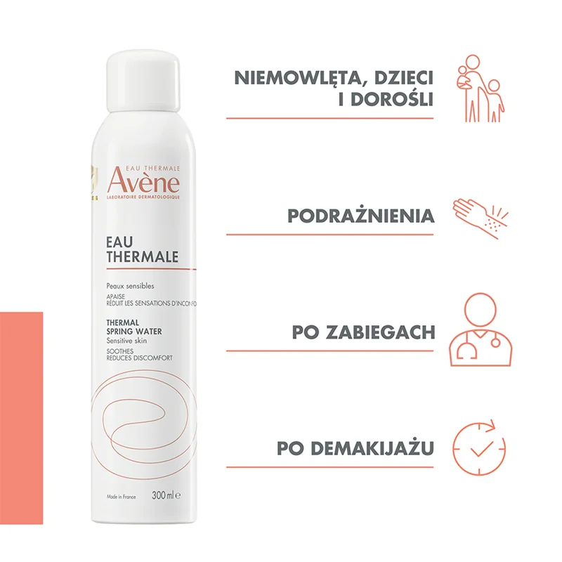Delikatną mgiełkę wody termalnej Avène należy rozpylić na skórze. Pozostawić na 1-3 minuty, następnie delikatnie osuszyć chusteczką. Bardzo ważne jest aby usunąć nadmiar wody, który wpływa wysuszająco.Informacje o bezpieczeństwie