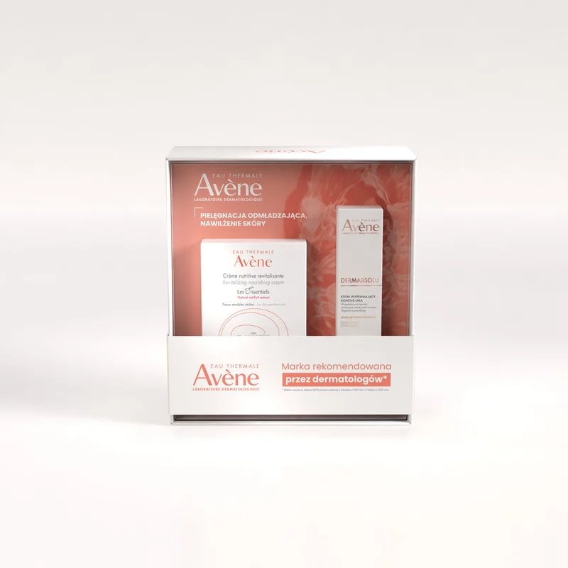 Avene Odżywczy krem rewitalizujący 50 ml: Nakładać rano i/lub wieczorem na dokładnie oczyszczoną skórę twarzy i szyi. Tylko do użytku zewnętrznego. Unikać kontaktu z oczami. Avene Dermabsolu krem wypełniający kontur oka 15 ml: Nakładać rano lub/i wieczorem, lekko wklepując w kontur oka. Można stosować na kontur ust.Informacje o bezpieczeństwie
