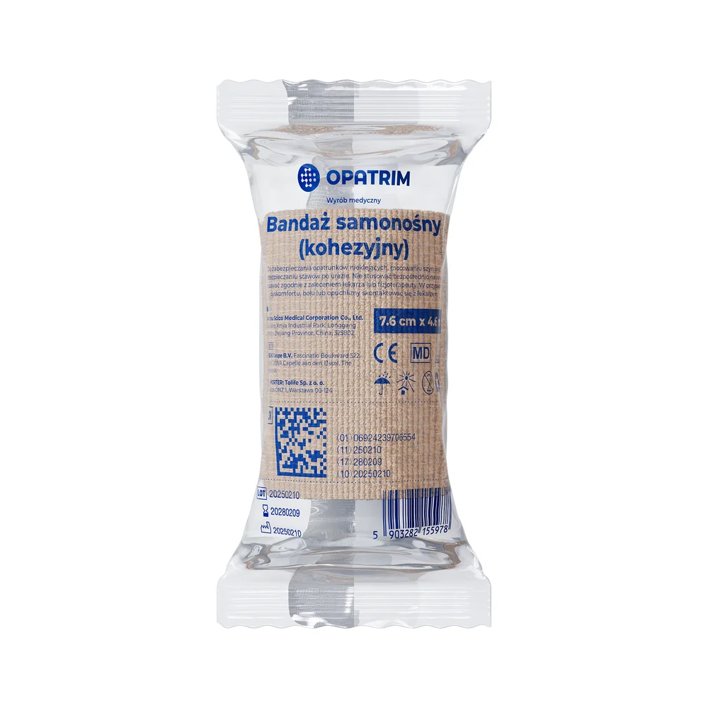 Opatrim Bandaż samonośny (kohezyjny) 7.6 cm x 4.6 m beż to wyrób medyczny, który sprawdzi się do zabezpieczania urazów i zwichnięć, a także do mocowaniu opatrunków czy szyn.