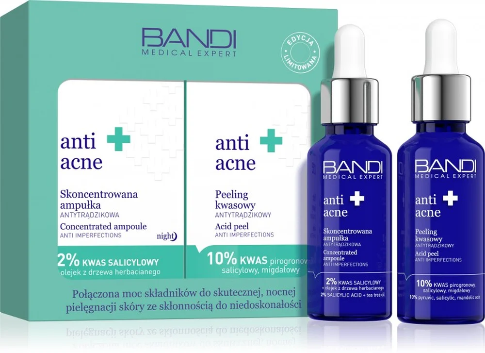 BANDI Medical Expert anti acne Zestaw antytrądzikowy to produkt kosmetyczny, który został opracowany z myślą o wymagającej cerze trądzikowej potrzebującej skutecznej, a jednocześnie kontrolowanej pielęgnacji. Synergia peelingu kwasowego i ampułki antytrądzikowej działa podczas nocnej regeneracji skóry, wspierając jej oczyszczanie, wygładzenie i ujednolicenie kolorytu. To kompleksowe rozwiązanie pomagające poprawić kondycję skóry i zmniejszyć skłonność do powstawania niedoskonałości.