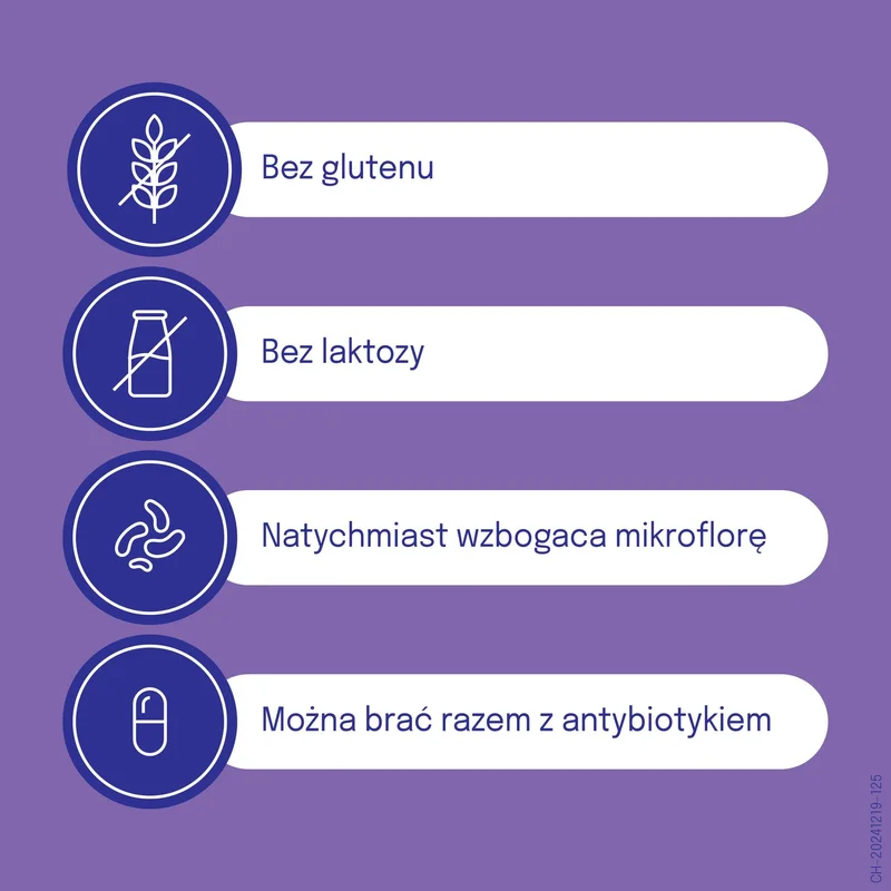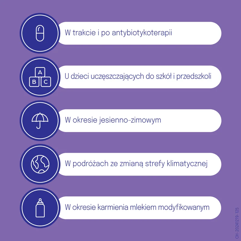 Pomagają utrzymać prawidłową florę jelitową, co może łagodzić dolegliwości trawienne i wspierać odporność w okresach zwiększonego ryzyka zaburzeń mikrobioty.
