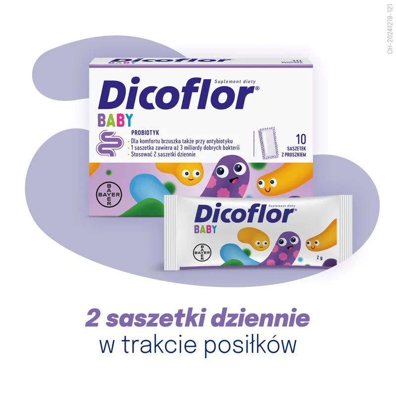 Bayer Dicoflor Baby to suplement diety zawierający szczep bakterii Lactobacillus rhamnosus GG, przeznaczony dla najmłodszych dzieci.
