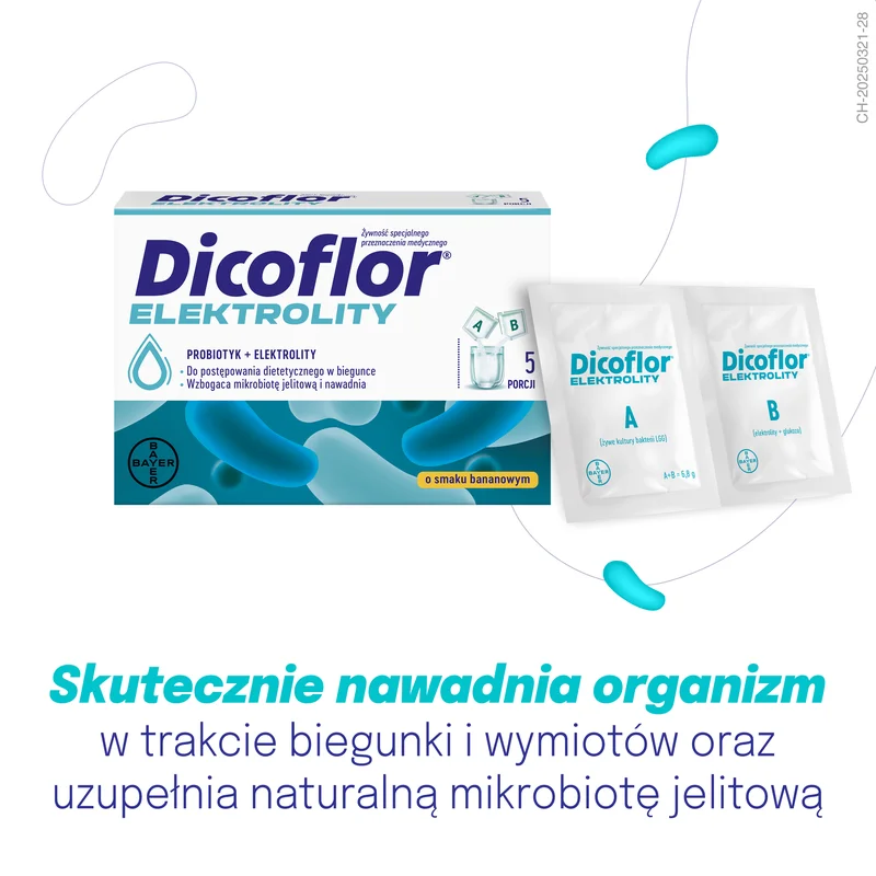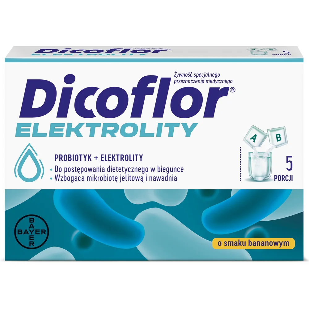 Bayer, Dicoflor Elektrolity o smaku bananowym to medyczny środek w formie proszku do przygotowania zawiesiny. Zawiera elektrolity, glukozę oraz żywe kultury bakterii Lactobacillus rhamnosus GG (ATCC 53103), które wspierają prawidłową mikroflorę jelitową. Produkt przeznaczony jest dla dorosłych oraz dzieci od 1. roku życia.