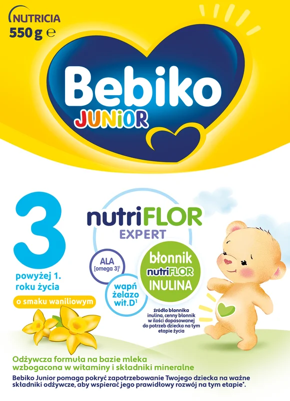 Bebiko Junior 3 NUTRIflor Expert – środek spożywczy specjalnego przeznaczenia żywieniowego o odżywczej formule na bazie mleka, o smaku waniliowym, przeznaczony dla dzieci powyżej 1. roku życia. Pomaga pokryć zapotrzebowanie dziecka na ważne składniki odżywcze, wspierając jego prawidłowy rozwój na tym etapie.