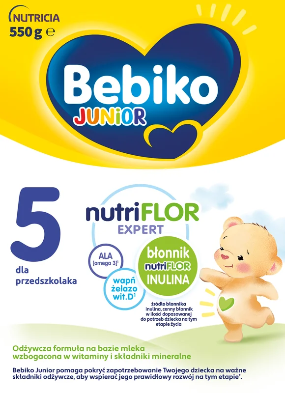 Bebiko Junior 5 NUTRIflor Expert – środek spożywczy specjalnego przeznaczenia żywieniowego z odżywczą formułą na bazie mleka, przeznaczony dla przedszkolaków. Wspiera pokrycie zapotrzebowania dziecka na niezbędne składniki odżywcze, pomagając w prawidłowym rozwoju na tym etapie. Produkt odpowiedni dla dzieci powyżej 2,5 roku życia.