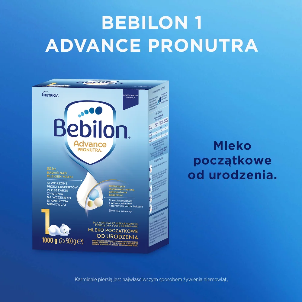 Bebilon 1 Pronutra-Advance mleko modyfikowane, początkowe przeznaczone do karmienia noworodków i niemowląt do ukończenia 6. miesiąca życia, które z jakiś powodów nie mogą być karmione piersią. Produkt może stanowić uzupełnienie karmienia naturalnego, jeśli zaistnieje konieczność dokarmiania. Zaleca się stosowanie produktu tylko po konsultacji z lekarzem.Właściwości produktu