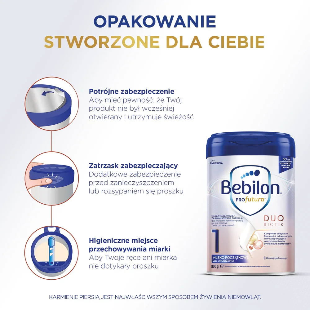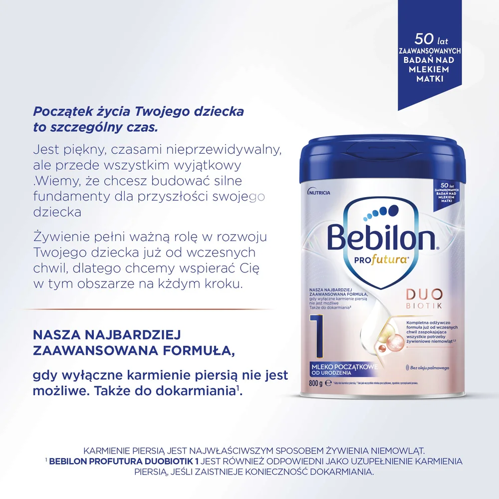 Bebilon PROfutura DuoBiotik 1 to środek spożywczy specjalnego przeznaczenia żywieniowego, przeznaczony dla niemowląt od urodzenia do 6. miesiąca życia. Stanowi pełnowartościową formułę odżywczą, która może być stosowana jako jedyne źródło pożywienia, gdy karmienie piersią nie jest możliwe, lub jako uzupełnienie karmienia naturalnego.