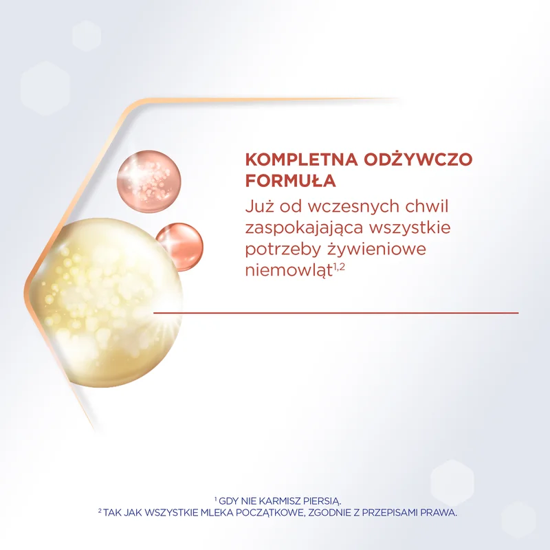 Laktoza z mleka, odtłuszczone mleko w proszku, odmineralizowana serwatka w proszku z mleka, bezwodny tłuszcz mleczny, galaktooligosacharydy GOS z mleka (8,95 %), olej rzepakowy, olej słonecznikowy, koncentrat serwatki z mleka, wysokooleinowy olej słonecznikowy, olej kokosowy, białko serwatkowe w proszku z mleka, 2'-fukozylolaktoza 2'FL (0,77 %), fruktooligosacharydy FOS (0,62 %), olej rybi, wapń, olej z Mortierella alpina, potas, sód, chlorek choliny, witamina C, magnez, emulgator (lecytyny z soi), inozytol, tauryna, żelazo, L-karnityna, cynk, witamina E, nukleotydy (sól sodowa kwasu urydyno-5’-fosforowego, kwas cytydyno-5’-monofosforowy, kwas adenozyno-5’-fosforowy, sól sodowa kwasu inozyno-5’-fosforowego, sól sodowa kwasu guanozyno-5’-fosforowego), przeciwutleniacz (palmitynian askorbylu), kwas pantotenowy, niacyna, L-tryptofan, miedź, tiamina, witamina A, ryboflawina, witamina B6, kwas foliowy, jod, selen, mangan, witamina K, witamina D, biotyna, witamina B12.