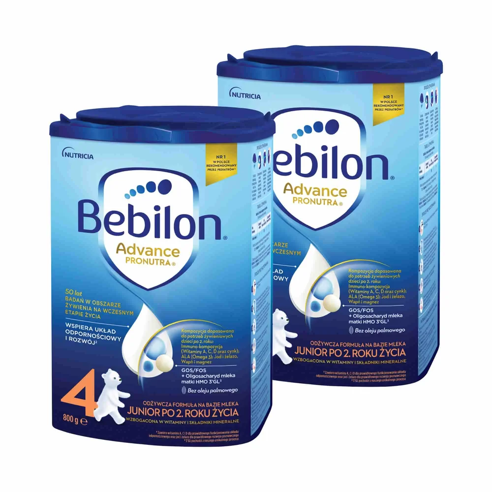 Niewłaściwe przygotowanie i przechowywanie może stanowić zagrożenie dla zdrowia dziecka.Odpowiednią ilość Bebilon 4 przygotuj zgodnie z tabelą żywienia. Nigdy nie dodawaj dodatkowych miarek proszku do przygotowywanego produktu. Porcja Bebilon 4 powinna być przygotowana zawsze bezpośrednio przed spożyciem i wykorzystana w ciągu 2 godzin po przygotowaniu. Nigdy nie należy używać ponownie niewypitej części produktu. Niewykorzystaną porcję należy wylać bezpośrednio po skończonym posiłku. Nie zaleca się podgrzewania produktu w kuchence mikrofalowej ze względu na zagrożenie oparzeniem.Dla zdrowia dziecka ważna jest urozmaicona i zbilansowana dieta oraz zdrowy tryb życia. Należy zwrócić uwagę na prawidłową higienę pierwszych ząbków, szczególnie przed snem. Produkt powinien stanowić tylko część zróżnicowanej diety dziecka.Karmienie piersią wraz z urozmaiconą dietą jest rekomendowanym sposobem żywienia małych dzieci. Powinno być kontynuowane tak długo, jak jest to pożądane przez matkę i dziecko. Przed podjęciem decyzji o zmianie sposobu karmienia należy zasięgnąć porady lekarza.Dla zachowania najwyższej jakości i właściwości produktu przed użyciem i po otwarciu przechowuj produkt w szczelnie zamkniętym, oryginalnym opakowaniu, w suchym miejscu, w temp. poniżej 25°C. Nie przechowuj produktu w lodówce. Zawartość opakowania należy zużyć do 4 tygodni po pierwszym otwarciu. Nie zaleca się przesypywania produktu do innych pojemników. Oryginalne opakowanie powinno być wyrzucone dopiero po wykorzystaniu zawartości ze względu na umieszczone na nim ważne informacje. Produkt pakowany w atmosferze ochronnej. Dla zdrowia dziecka ważna jest urozmaicona i zbilansowana dieta oraz zdrowy tryb życia. Należy zwrócić uwagę na prawidłową higienę pierwszych ząbków, szczególnie przed snem. Produkt powinien stanowić tylko część zróżnicowanej diety dziecka. Ostrzeżenie: niewłaściwe przygotowanie i przechowywanie może stanowić zagrożenie dla zdrowia dziecka.Producent: NUTRICIA POLSKA Sp. z o.o. , ul. Bobrowiecka 8, 00-728 Warszawa