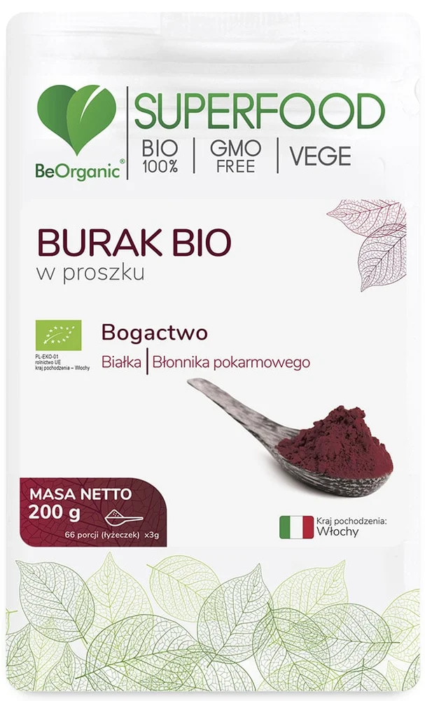 BeOrganic, Burak Bio w proszku to środek spożywczy, który składa się z suszonego buraka bio. Produkt jest w 100% naturalny i nie zawiera dodatków ani konserwantów. Burak w proszku znajduje zastosowanie w kuchni jako składnik koktajli, smoothie, wypieków oraz potraw, dodając im intensywnego koloru i smaku.