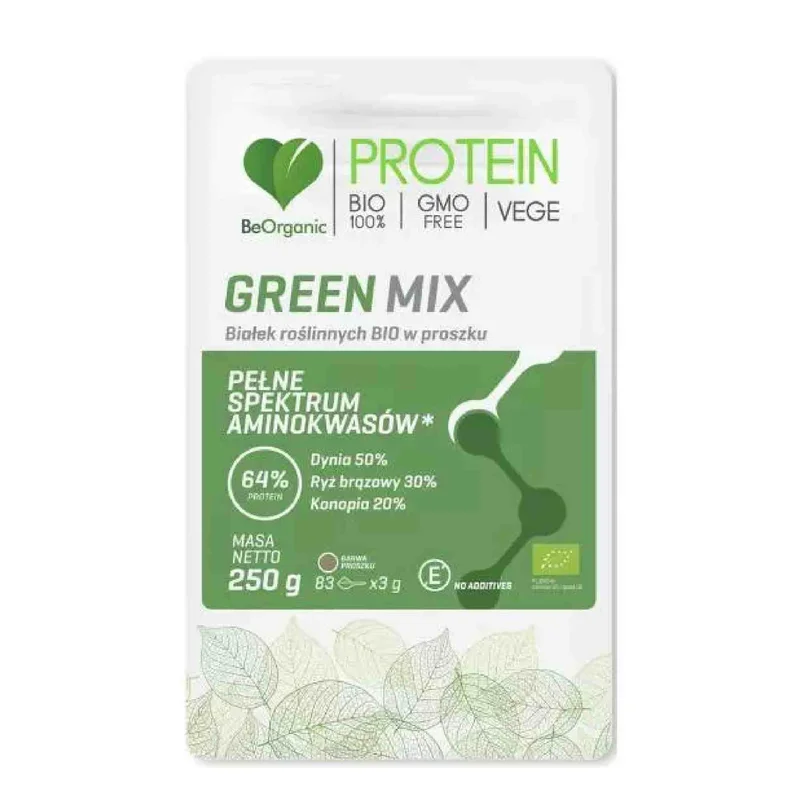 BeOrganic Green Mix białek roślinnych BIO w proszku to starannie skomponowana mieszanka składników pochodzenia roślinnego, przeznaczona dla osób prowadzących świadomy styl życia. Formuła oparta na pestkach dyni, ryżu brązowym i konopiach dostarcza pełnowartościowe białko roślinne, które stanowi 64% produktu. Produkt jest odpowiedni dla osób z nietolerancją glutenu i białek mlecznych oraz dla diety wegańskiej i wegetariańskiej. Green Mix BIO zawiera naturalnie występujące witaminy z grupy B, minerały oraz błonnik pokarmowy, a surowce użyte do produkcji pochodzą z certyfikowanych upraw ekologicznych, wolnych od GMO
