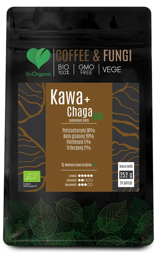 BeOrganic, Kawa Arabica mielona + Chaga BIO to suplement diety, który łączy mieloną kawę Arabica z ekstraktem z grzybów Chaga (Inonotus obliquus), standaryzowanym na zawartość charakterystycznych dla grzybów substancji aktywnych. Ekologiczna kawa Arabica, użyta w produkcie, pochodzi z peruwiańskich Andów. Takie połączenie kawy i ekstraktu z grzybów daje wyjątkowy, pełen głębi smak. Wszystkie składniki są w 100% ekologiczne, bez dodatków technologicznych i smakowych, a produkt nie zawiera składników pochodzenia zwierzęcego, dzięki czemu jest odpowiedni dla wegan.