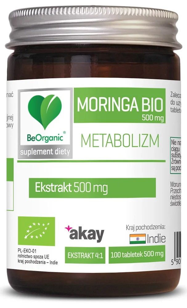 BeOrganic, Moringa ekstrakt BIO, 500 mg, tabletki, 100 sztuk