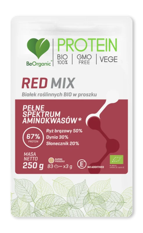 BeOrganic Red Mix BIO to środek spożywczy w formie proszku, stanowiący połączenie wyselekcjonowanych białek roślinnych pochodzących z ekologicznych, certyfikowanych upraw. Mieszanka białek z brązowego ryżu, pestek dyni i nasion słonecznika zapewnia pełne spektrum aminokwasów oraz zbilansowany skład. Produkt wyróżnia się wysokim wskaźnikiem jakości białka, którego współczynnik CS wynosi 144.