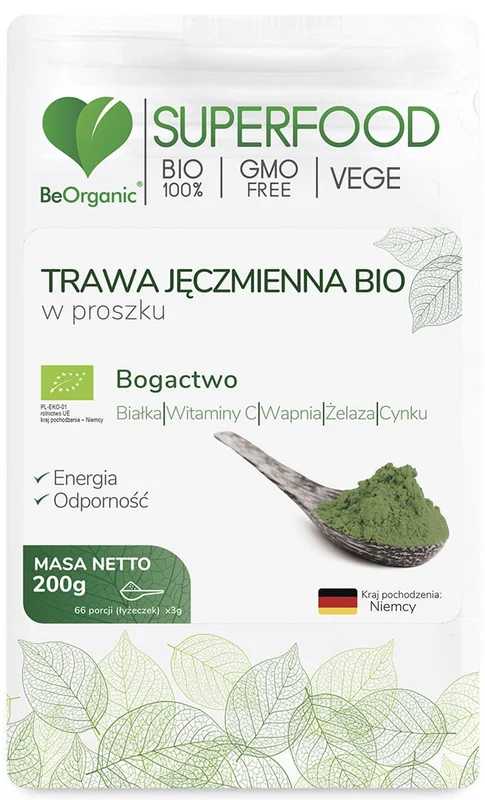 Ekologiczna trawa jęczmienna BeOrganic w proszku powstaje z młodych liści jęczmienia zwyczajnego, pozyskiwanych na wczesnym etapie rozwoju rośliny. Proszek charakteryzuje się świeżym, zielonym kolorem oraz wyrazistym, liściastym aromatem. Sprawdza się jako składnik koktajli, soków oraz potraw przygotowywanych na zimno. Produkt jest naturalnym źródłem chlorofilu, błonnika pokarmowego, białka oraz minerałów, takich jak wapń, magnez, żelazo i cynk, a także witaminy C. Zawarte w jęczmieniu (Hordeum vulgare) składniki pochodzenia naturalnego wspierają ochronę tkanek i komórek przed uszkodzeniami oksydacyjnymi oraz sprzyjają zachowaniu prawidłowych funkcji organizmu. Produkt pochodzi w całości z certyfikowanych upraw ekologicznych.