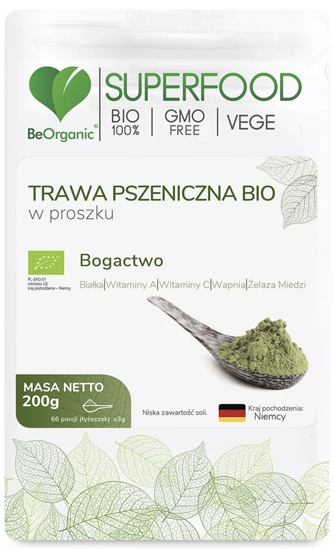 BeOrganic, Trawa pszeniczna Bio w proszku to środek spożywczy, uzyskany z ekologicznie uprawianej trawy pszenicznej. Proszek posiada intensywny zielony kolor i charakterystyczny zapach trawy.