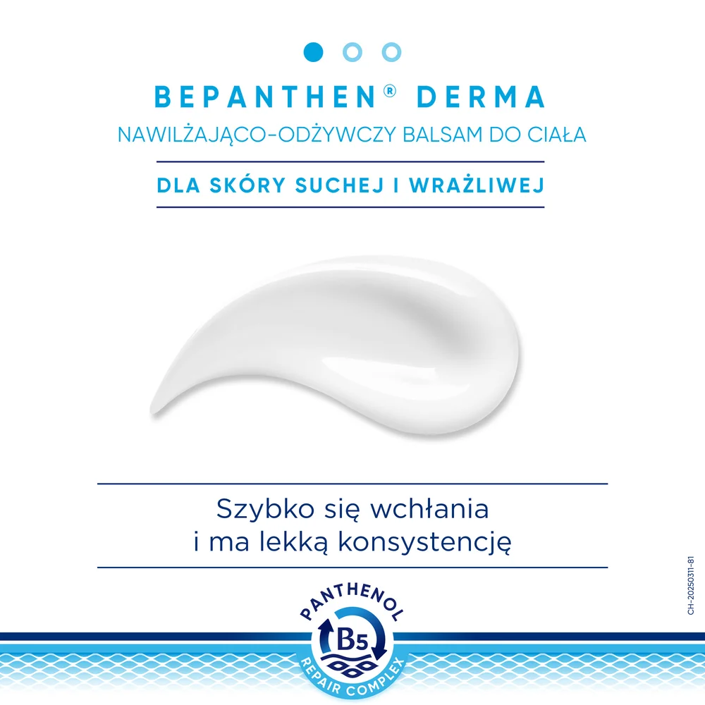 Bepanthen Derma nawilżająco-odżywczy balsam do ciała to produkt kosmetyczny przeznaczony do codziennej pielęgnacji i nawilżenia skóry ciała.Składniki/Ingredients