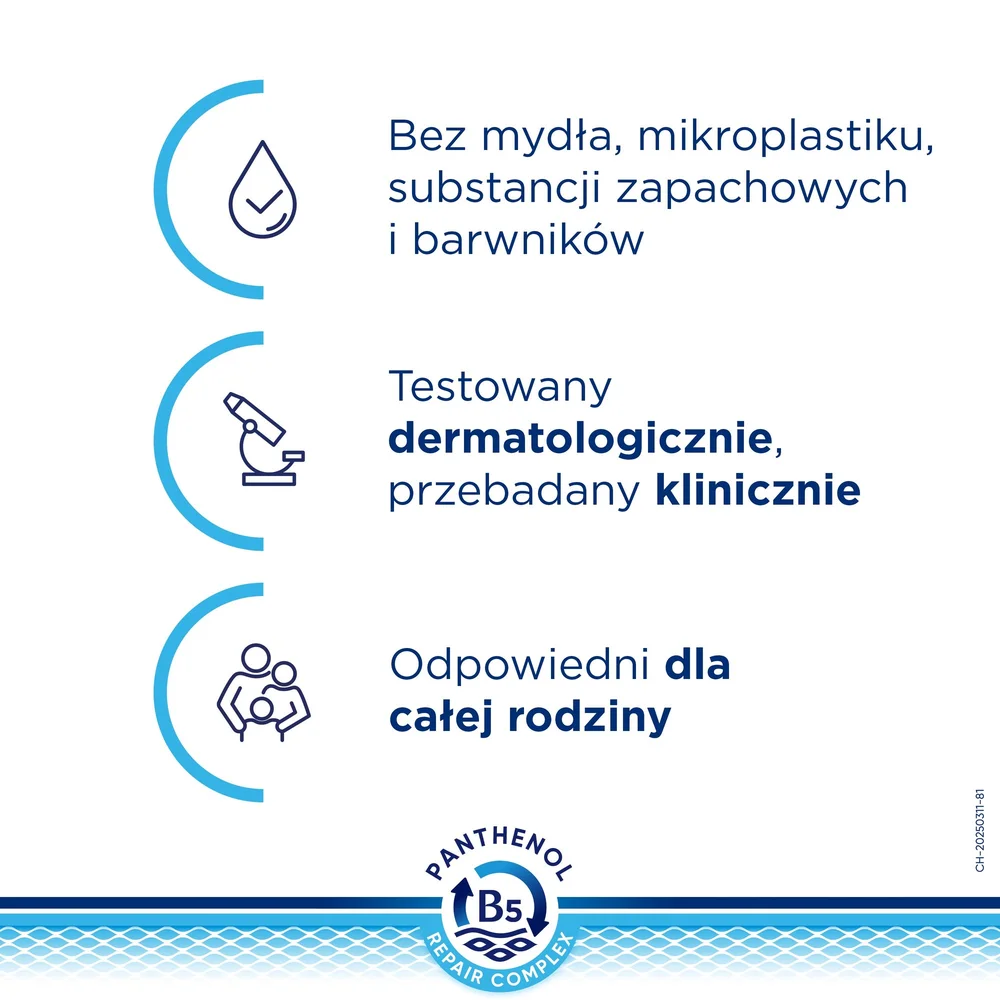 Pantenol (prowitamina B5) – wspiera naturalną regenerację skóry, działając w jej głębszych warstwach.Witamina B3 (niacynamid) – redukuje suchość i łagodzi uczucie świądu.Naturalne lipidy (np. olej arganowy) – chronią przed wysuszeniem, uzupełniając niedobory lipidów w skórze.Gliceryna – intensywnie nawilża, zapewniając długotrwałe uczucie komfortu.Stosowanie produktu