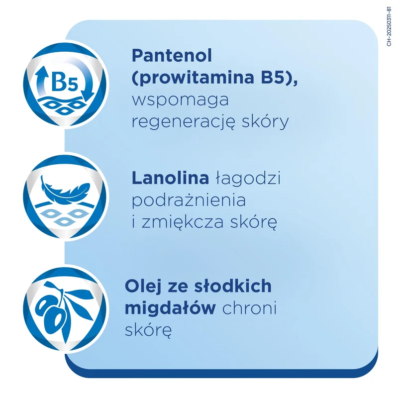 Aqua, Lanolin, Paraffinum Liquidum, Petrolatum, Panthenol, Prunus Amygdalus Dulcis Oil, Cera Alba, Cetyl Alcohol, Stearyl Alcohol, Ozokerite, Glyceryl Oleate, Lanolin Alcohol, Bht, Tocopherol.Przeznaczenie produktu