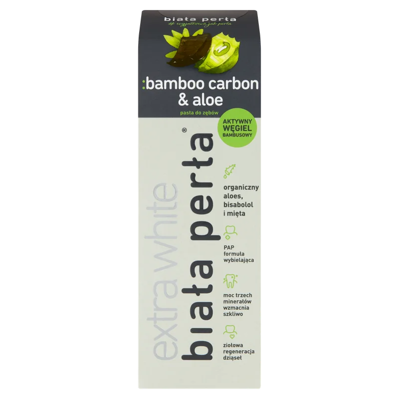 BIAŁA PERŁA EXTRA WHITE Pasta do zębów Bamboo carbon & aloe jest przeznaczona do codziennego używania. Pochłania przebarwienia powstałe na zewnętrznej warstwie szkliwa zębów oraz usuwa głębsze przebarwienia spowodowane piciem kawy lub herbaty. Chroni przed powstawaniem ubytków, wzmacnia dziąsła, a jednocześnie pozostawia uczucie gładkich zębów. Pasta jest przeznaczona wyłącznie dla osób dorosłych.Stosowanie produktu