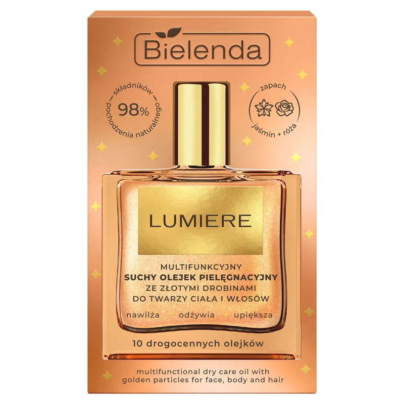 Bielenda Lumiere to produkt kosmetyczny, multifunkcyjny suchy olejek pielęgnacyjny ze złotymi drobinami do twarzy, ciała i włosów. Olejek nawilża, regeneruje oraz odżywia skórę, dodając jej blasku. Formuła jest lekka i szybko się wchłania, co umożliwia łatwe użycie na wszystkich typach skóry.