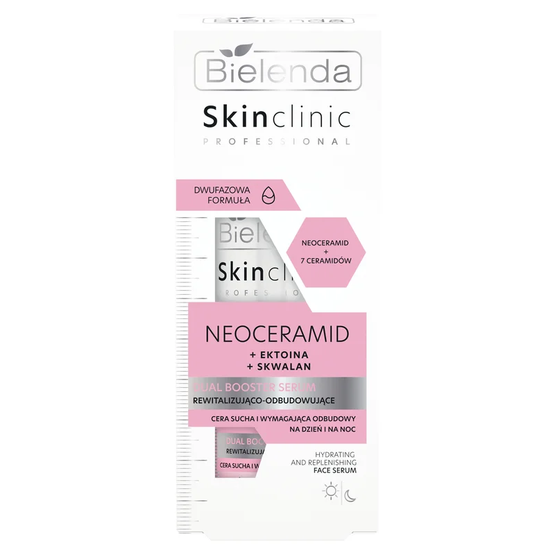 Bielenda Skin Clinic Professional Neoceramid, dual booster serum nawilżająco-odbudowujące to produkt kosmetyczny zaprojektowane z myślą o intensywnej odbudowie i nawilżeniu skóry z osłabioną barierą ochronną. Produkt szybko poprawia kondycję naskórka oraz przywraca cerze równowagę, komfort i zdrowy wygląd.