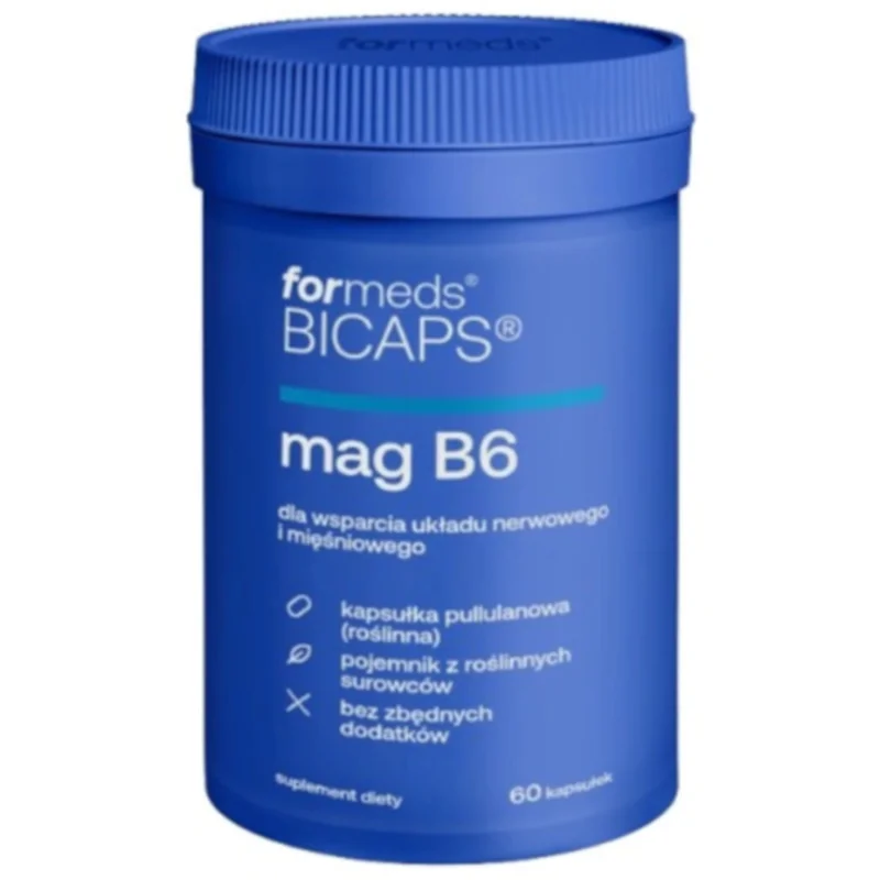 Bicaps Mag B6 to suplement diety zawierający składniki wspierające prawidłowe funkcjonowanie mięśni i układu nerwowego. Produkt przeznaczony dla osób dorosłych.